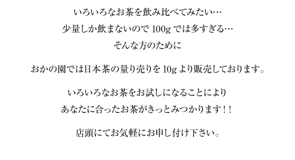 現在のページ:おかの園トップ > 日本茶の量り売り10g〜販売