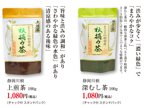 お客様のご要望にお応えし、今年も2種類(上煎茶・深むし茶)の秋づみ新茶をご用意しました。